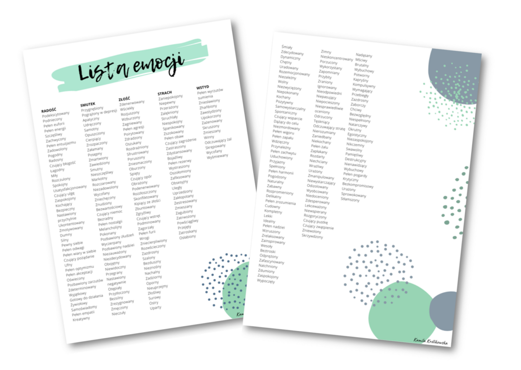- lista zawierająca 286 określeń emocji opisujących: radość, smutek, złość, strach, wstyd